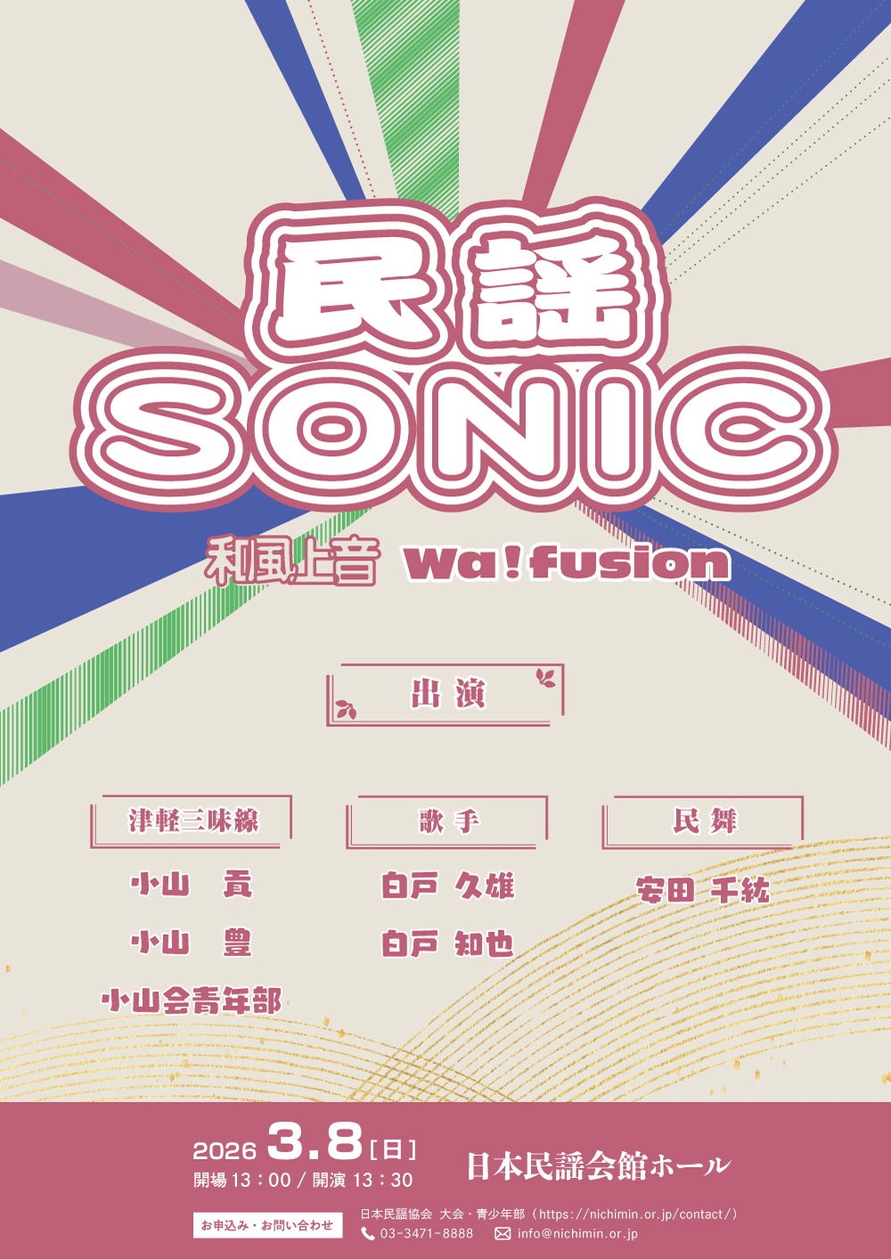 伝統的な津軽民謡を軸に、現代の三味線の響きと唄のエネルギーが交錯する、民謡SONICならではのステージをお楽しみください。